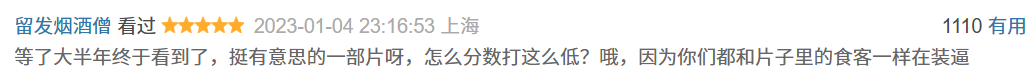 “等了大半年终于看到了,挺有意思的一部片呀,怎么分数打这么低?哦,因为你们都和片子里的食客一样在装逼。”